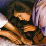Llevaba en sus manos un artístico frasco de alabastro, lleno de preciosísimo nardo. Rompiéndolo ungió su cabeza y, luego, arrodillándose a sus plantas vertió lo que aún le quedaba sobre los pies de Jesús. Luego los enjugó con su larga cabellera.